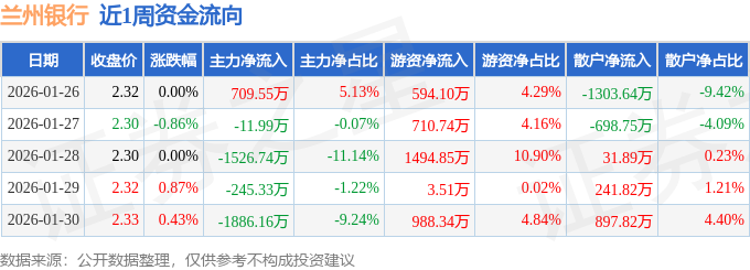 资金流向数据方面,本周兰州银行主力资金合计净流出2960.68万元,游资资金合计净流入3791.55万元,散户资金合计净流出830.87万元。本周资金流向一览见下表: