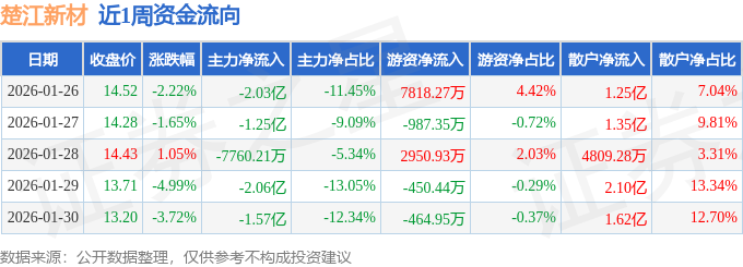 资金流向数据方面,本周楚江新材主力资金合计净流出7.68亿元,游资资金合计净流入8866.46万元,散户资金合计净流入6.79亿元。本周资金流向一览见下表: