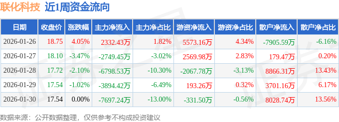 资金流向数据方面,本周联化科技主力资金合计净流出1.88亿元,游资资金合计净流入5937.13万元,散户资金合计净流入1.29亿元。本周资金流向一览见下表: