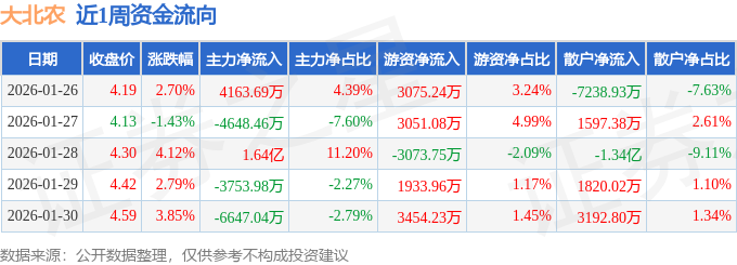 资金流向数据方面,本周大北农主力资金合计净流入5563.24万元,游资资金合计净流入8440.77万元,散户资金合计净流出1.4亿元。本周资金流向一览见下表: