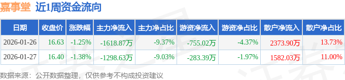 证券之星消息,截至2026年1月27日收盘,嘉事堂(002462)报收于16.4元,较上周的16.84元下跌2.61%。本周,嘉事堂1月26日盘中最高价报16.82元。1月27日盘中最低价报16.0元。嘉事堂当前最新总市值47.84亿元,在医药商业板块市值排名24/32,在两市A股市值排名3600/5184。