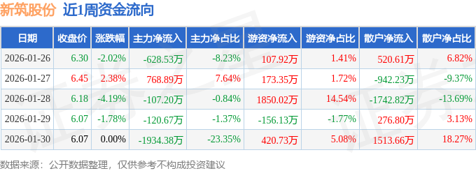 资金流向数据方面,本周新筑股份主力资金合计净流出2021.89万元,游资资金合计净流入2395.89万元,散户资金合计净流出374.0万元。本周资金流向一览见下表:
