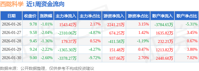 资金流向数据方面,本周西陇科学主力资金合计净流出5330.84万元,游资资金合计净流入3593.04万元,散户资金合计净流入1737.8万元。本周资金流向一览见下表: