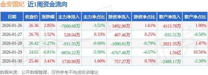 资金流向数据方面,本周金安国纪主力资金合计净流出1.51亿元,游资资金合计净流出3199.85万元,散户资金合计净流入1.83亿元。本周资金流向一览见下表:
