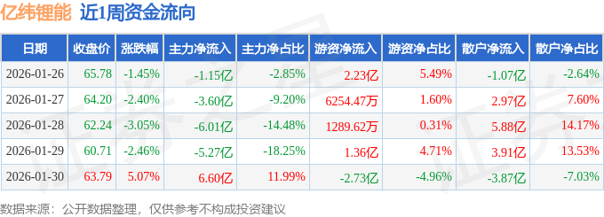 资金流向数据方面,本周亿纬锂能主力资金合计净流出9.43亿元,游资资金合计净流入1.61亿元,散户资金合计净流入7.82亿元。本周资金流向一览见下表: