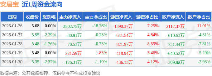 资金流向数据方面,本周安居宝主力资金合计净流出3508.91万元,游资资金合计净流入3708.96万元,散户资金合计净流出200.05万元。本周资金流向一览见下表: