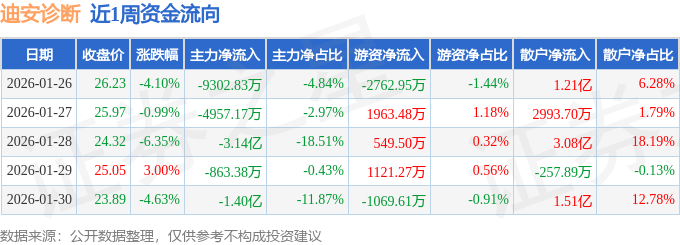 资金流向数据方面,本周迪安诊断主力资金合计净流出6.05亿元,游资资金合计净流出198.31万元,散户资金合计净流入6.07亿元。本周资金流向一览见下表:
