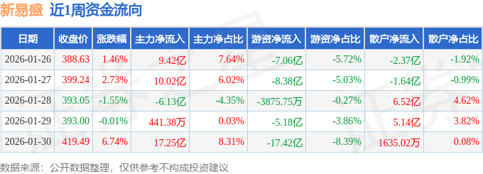 资金流向数据方面,本周新易盛主力资金合计净流入30.61亿元,游资资金合计净流出38.43亿元,散户资金合计净流入7.82亿元。本周资金流向一览见下表: