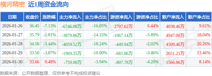 资金流向数据方面,本周横河精密主力资金合计净流出1.74亿元,游资资金合计净流出299.09万元,散户资金合计净流入1.77亿元。本周资金流向一览见下表: