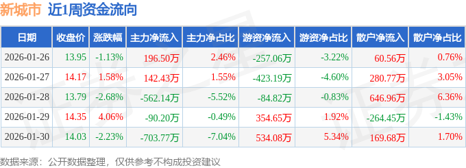 资金流向数据方面,本周新城市主力资金合计净流出1017.18万元,游资资金合计净流入123.65万元,散户资金合计净流入893.53万元。本周资金流向一览见下表: