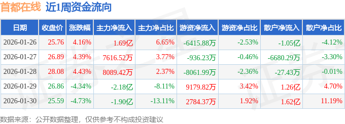 证券之星消息,截至2026年1月30日收盘,首都在线(300846)报收于25.59元,较上周的24.73元上涨3.48%。本周,首都在线1月28日盘中最高价报30.59元。1月27日盘中最低价报24.6元。首都在线当前最新总市值128.69亿元,在IT服务板块市值排名37/119,在两市A股市值排名1635/5184。