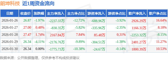 资金流向数据方面,本周朗坤科技主力资金合计净流出4852.32万元,游资资金合计净流出1268.62万元,散户资金合计净流入6120.94万元。本周资金流向一览见下表: