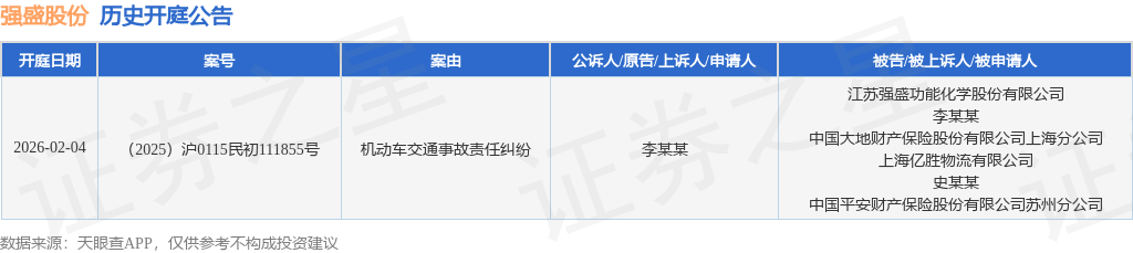 根据统计,近一年内以江苏强盛功能化学股份有限公司为当事人的历史开庭公告有1则,其中案由为“机动车交通事故责任纠纷”的公告以1则居首。历史开庭公告如下: