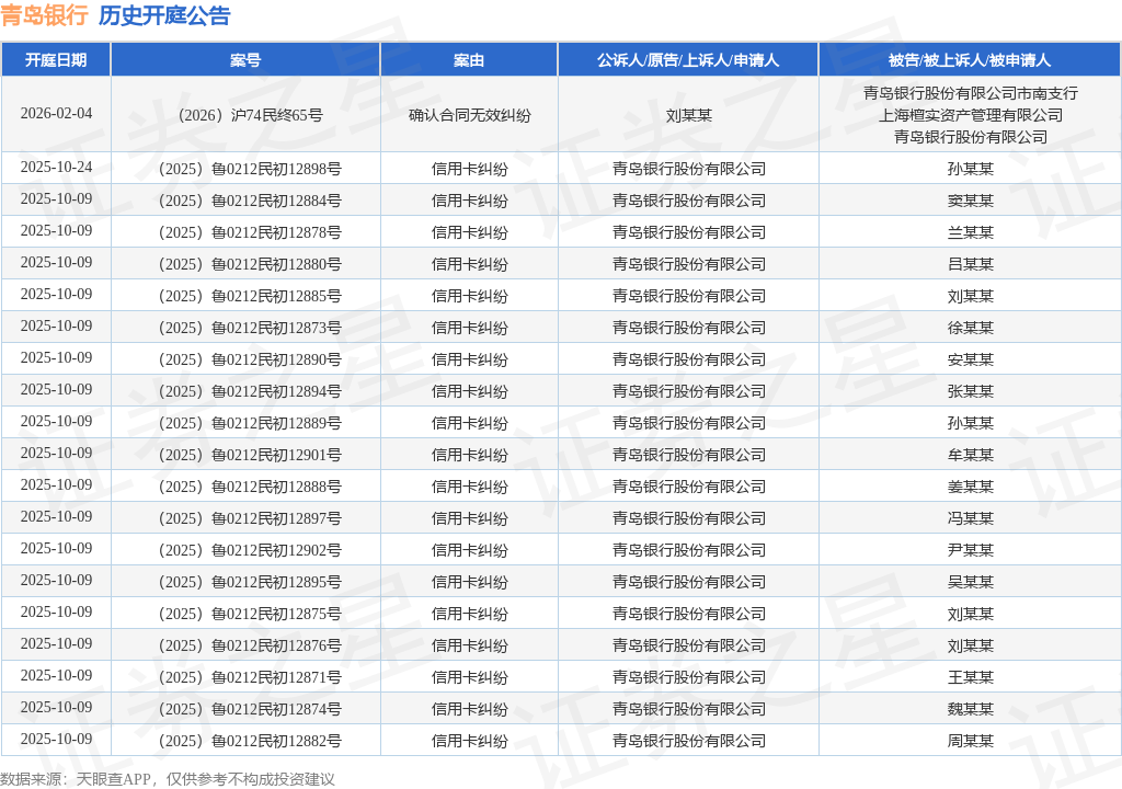 案号:(2026)沪74民终65号根据统计,近一年内以青岛银行股份有限公司为当事人的历史开庭公告有54则,其中案由为“信用卡纠纷”的公告以48则居首,其次为“合同纠纷”有2则,“确认合同无效纠纷”有2则。历史开庭公告(前20条)如下: