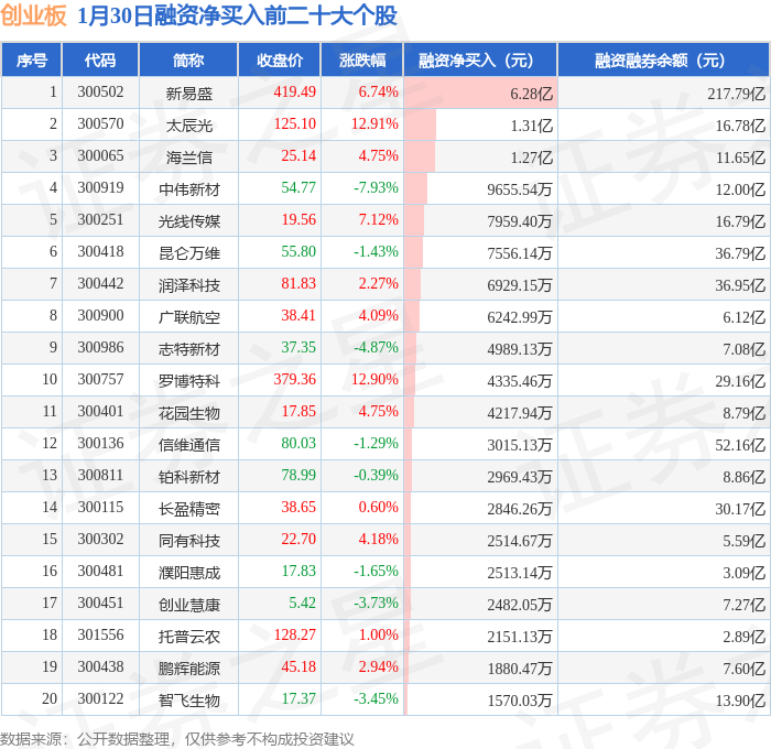 创业板融资净买入前三分别为:新易盛(300502)融资净买入6.28亿元、太辰光(300570)融资净买入1.31亿元、海兰信(300065)融资净买入1.27亿元,前20具体见下表: