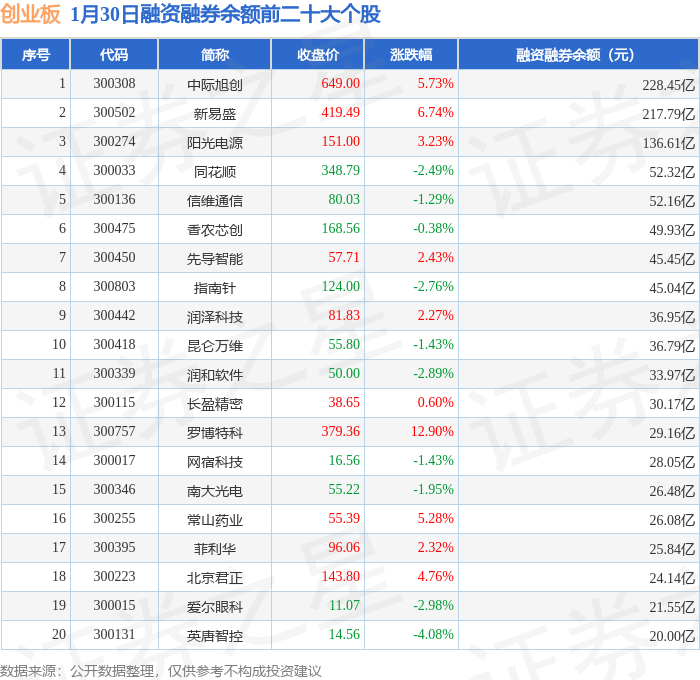 创业板融资融券余额前三分别为:中际旭创(300308)融资融券余额228.45亿元、新易盛(300502)融资融券余额217.79亿元、阳光电源(300274)融资融券余额136.61亿元,前20具体见下表: