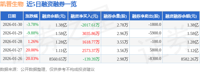 凯普生物融资融券信息显示,融资方面,当日融资买入5202.34万元,融资偿还7219.95万元,融资净偿还2017.61万元。融券方面,融券卖出200.0股,融券偿还2000.0股,融券余量2.78万股,融券余额21.24万元。融资融券余额1.38亿元。