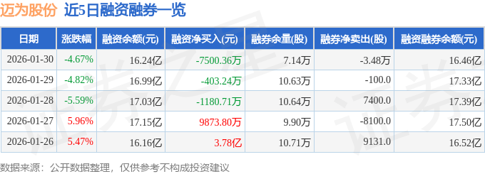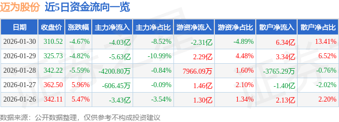 证券之星消息,截至2026年1月30日收盘,迈为股份(300751)报收于310.52元,下跌4.67%,换手率7.87%,成交量15.21万手,成交额47.29亿元。