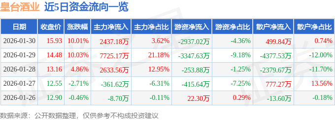 1月30日的资金流向数据方面,主力资金净流入2437.18万元,占总成交额3.62%,游资资金净流出2937.02万元,占总成交额4.36%,散户资金净流入499.84万元,占总成交额0.74%。