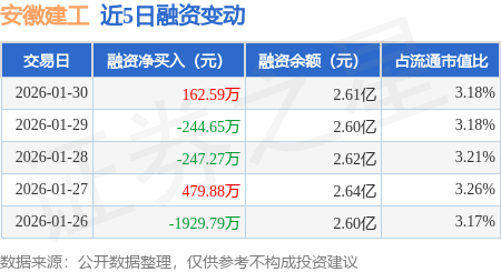 证券之星消息,1月30日,安徽建工(600502)融资买入1411.67万元,融资偿还1249.08万元,融资净买入162.59万元,融资余额2.61亿元。