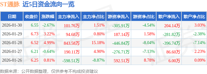1月30日的资金流向数据方面,主力资金净流入101.76万元,占总成交额1.51%,游资资金净流出305.91万元,占总成交额4.54%,散户资金净流入204.14万元,占总成交额3.03%。