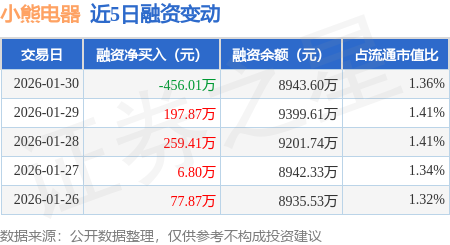 证券之星消息,1月30日,小熊电器(002959)融资买入812.87万元,融资偿还1268.87万元,融资净卖出456.01万元,融资余额8943.6万元,近20个交易日中有12个交易日出现融资净买入。