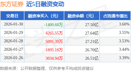 证券之星消息,1月30日,东方证券(600958)融资买入8544.52万元,融资偿还9945.2万元,融资净卖出1400.68万元,融资余额27.5亿元,近20个交易日中有14个交易日出现融资净买入。
