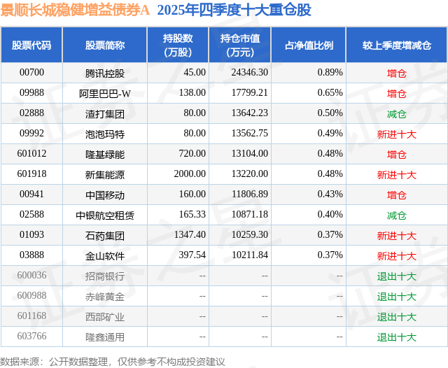 根据2025基金年报公募基金重仓股数据,重仓该股的公募基金共13家,其中持有数量最多的公募基金为景顺长城基金的景顺长城稳健增益债券A。景顺长城稳健增益债券A目前规模为105.4亿元,最新净值1.1775(1月30日),较上一交易日下跌0.23%,近一年上涨8.01%。该公募基金现任基金经理为彭成军。彭成军在任的基金产品包括:景顺长城景泰盈利纯债,管理时间为2020年9月12日至今,期间收益率为25.28%;景顺长城景泰裕利纯债债券A,管理时间为2020年9月12日至今,期间收益率为21.39%;景顺长城景泰恒利一年定开债,管理时间为2021年1月8日至今,期间收益率为17.85%;景顺长城中短债A,管理时间为2021年2月6日至今,期间收益率为15.07%。