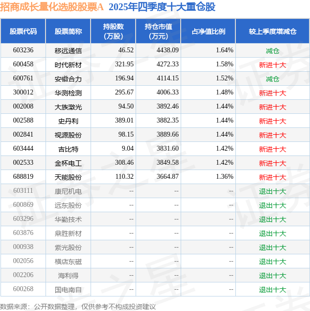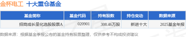 根据2025基金年报公募基金重仓股数据,重仓该股的公募基金共1家,其中持有数量最多的公募基金为招商基金的招商成长量化选股股票A。招商成长量化选股股票A目前规模为13.73亿元,最新净值1.671(1月30日),较上一交易日下跌0.43%,近一年上涨45.75%。该公募基金现任基金经理为王平。王平在任的基金产品包括:招商量化精选股票A,管理时间为2016年3月15日至今,期间收益率为304.4%;招商沪深300指数增强A,管理时间为2017年2月10日至今,期间收益率为86.49%;招商中证红利ETF,管理时间为2019年11月28日至今,期间收益率为109.51%;招商中证光伏产业指数A,管理时间为2021年6月18日至今,期间收益率为-24.68%。