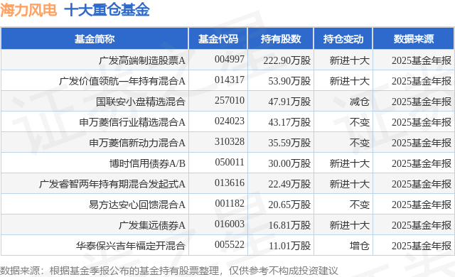 重仓海力风电的前十大公募基金请见下表: