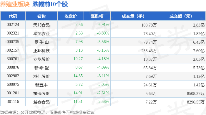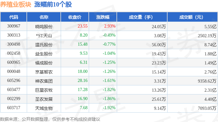 从资金流向上来看,当日养殖业板块主力资金净流出1.21亿元,游资资金净流出2.2亿元,散户资金净流入3.42亿元。养殖业板块个股资金流向见下表: