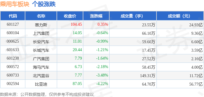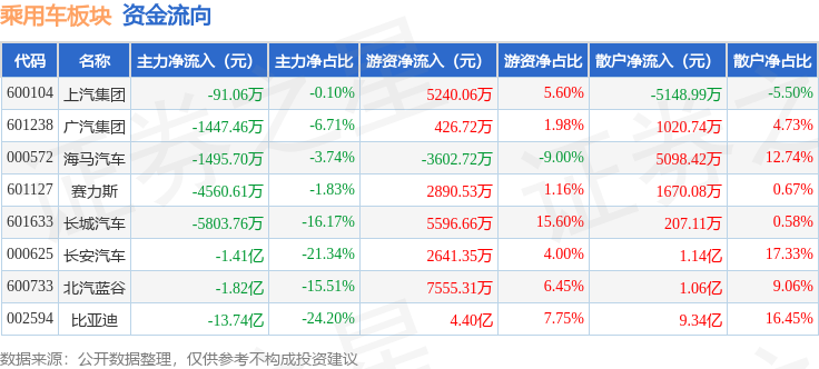 从资金流向上来看,当日乘用车板块主力资金净流出18.3亿元,游资资金净流入6.47亿元,散户资金净流入11.83亿元。乘用车板块个股资金流向见下表: