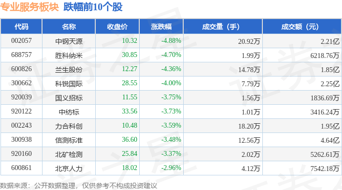 证券之星消息,2月2日专业服务板块较上一交易日下跌1.7%,中钢天源领跌。当日上证指数报收于4015.75,下跌2.48%。深证成指报收于13824.35,下跌2.69%。专业服务板块个股涨跌见下表: