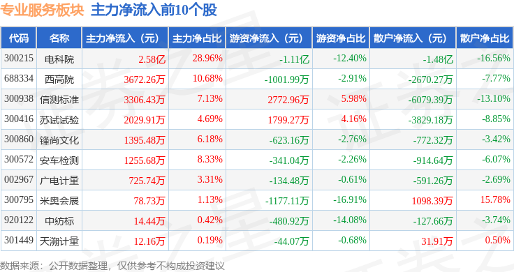 从资金流向上来看,当日专业服务板块主力资金净流入2.33亿元,游资资金净流出7652.44万元,散户资金净流出1.57亿元。专业服务板块个股资金流向见下表:
