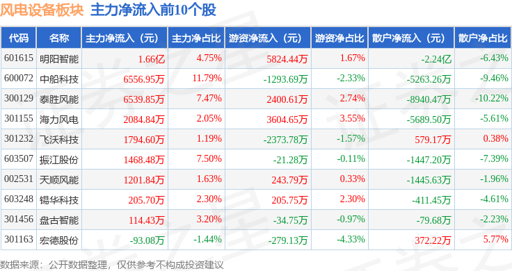 从资金流向上来看,当日风电设备板块主力资金净流出4.99亿元,游资资金净流入2.23亿元,散户资金净流入2.76亿元。风电设备板块个股资金流向见下表:
