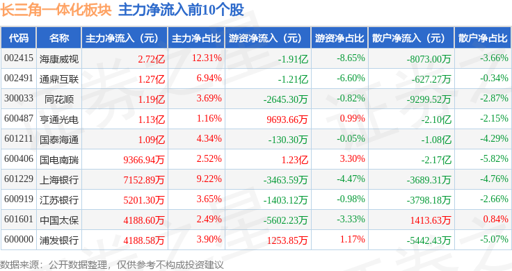 从资金流向上来看,当日长三角一体化板块主力资金净流出34.15亿元,游资资金净流入16.91亿元,散户资金净流入17.24亿元。长三角一体化板块个股资金流向见下表: