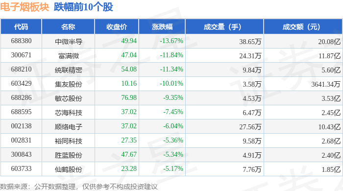 证券之星消息,2月2日电子烟板块较上一交易日下跌1.71%,中微半导领跌。当日上证指数报收于4015.75,下跌2.48%。深证成指报收于13824.35,下跌2.69%。电子烟板块个股涨跌见下表: