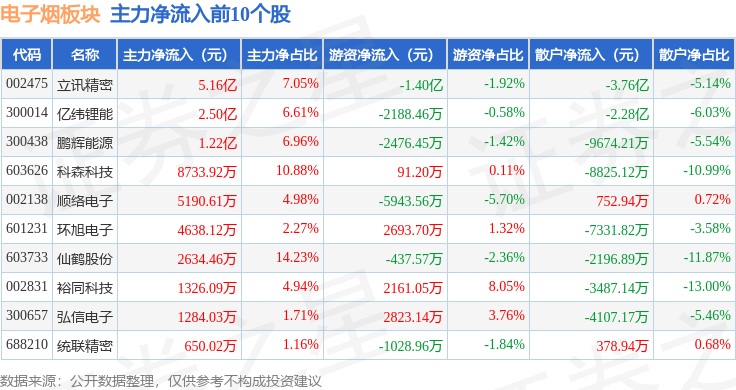 从资金流向上来看,当日电子烟板块主力资金净流出1.59亿元,游资资金净流入1.43亿元,散户资金净流入1606.03万元。电子烟板块个股资金流向见下表: