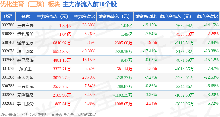 从资金流向上来看,当日优化生育(三孩)板块主力资金净流出8.04亿元,游资资金净流入9018.06万元,散户资金净流入7.14亿元。优化生育(三孩)板块个股资金流向见下表: