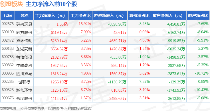 从资金流向上来看,当日创投板块主力资金净流出34.2亿元,游资资金净流入11.96亿元,散户资金净流入22.24亿元。创投板块个股资金流向见下表: