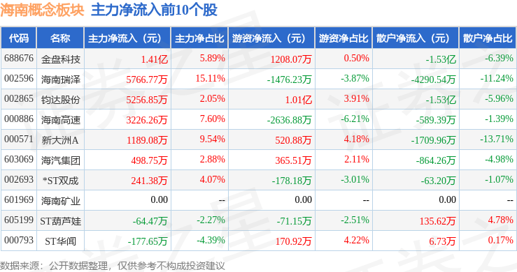 从资金流向上来看,当日海南概念板块主力资金净流出12.79亿元,游资资金净流入2.79亿元,散户资金净流入10.0亿元。海南概念板块个股资金流向见下表: