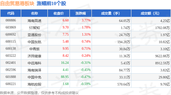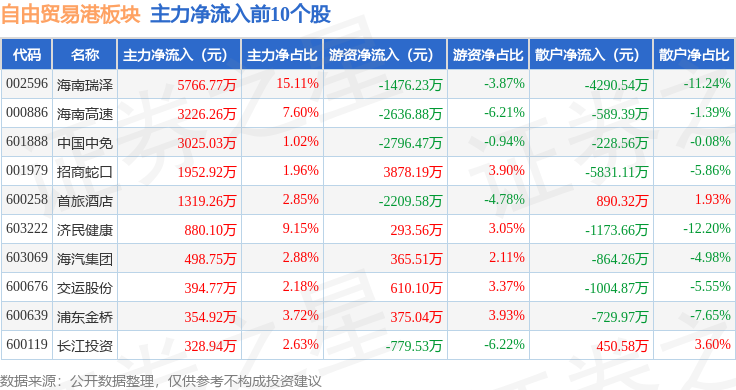从资金流向上来看,当日自由贸易港板块主力资金净流出12.01亿元,游资资金净流入2.12亿元,散户资金净流入9.89亿元。自由贸易港板块个股资金流向见下表: