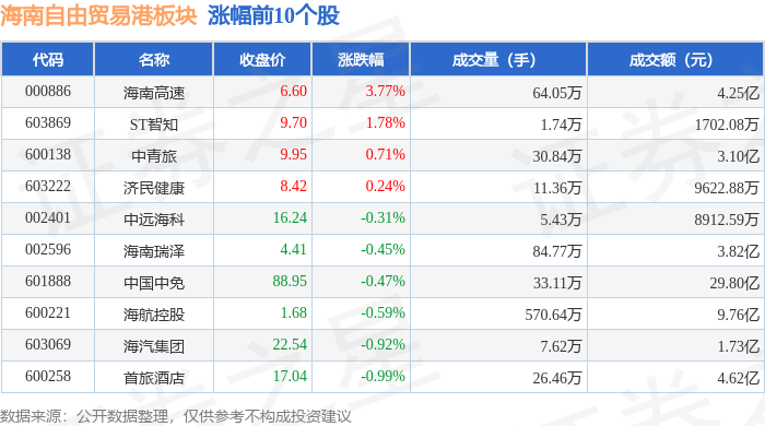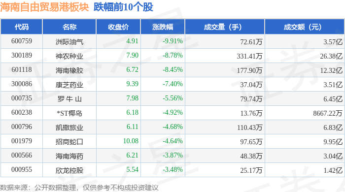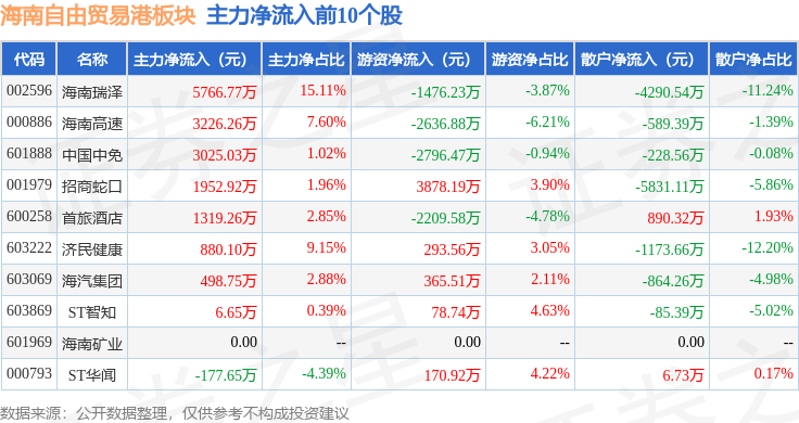 从资金流向上来看,当日海南自由贸易港板块主力资金净流出6.37亿元,游资资金净流入5016.98万元,散户资金净流入5.86亿元。海南自由贸易港板块个股资金流向见下表: