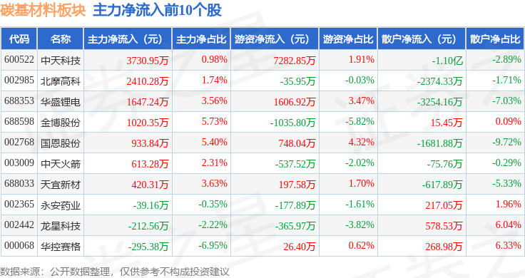 从资金流向上来看,当日碳基材料板块主力资金净流出6.9亿元,游资资金净流入2.13亿元,散户资金净流入4.77亿元。碳基材料板块个股资金流向见下表:
