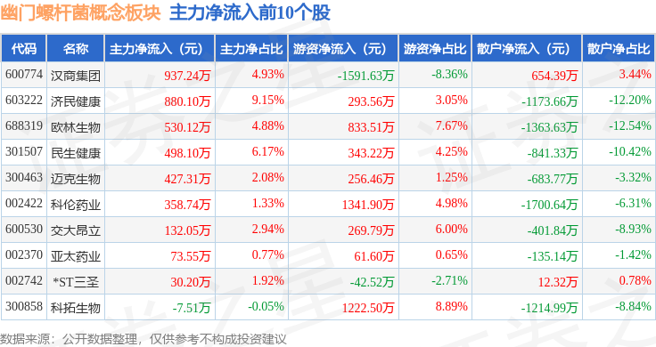 从资金流向上来看,当日幽门螺杆菌概念板块主力资金净流出4.36亿元,游资资金净流入9191.42万元,散户资金净流入3.44亿元。幽门螺杆菌概念板块个股资金流向见下表: