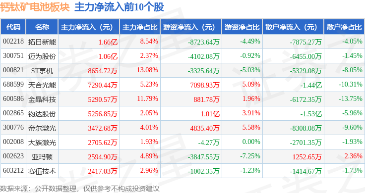 从资金流向上来看,当日钙钛矿电池板块主力资金净流出1.58亿元,游资资金净流入4.7亿元,散户资金净流出3.12亿元。钙钛矿电池板块个股资金流向见下表: