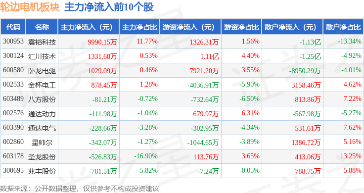 从资金流向上来看,当日轮边电机板块主力资金净流出1.12亿元,游资资金净流入2.06亿元,散户资金净流出9334.24万元。轮边电机板块个股资金流向见下表: