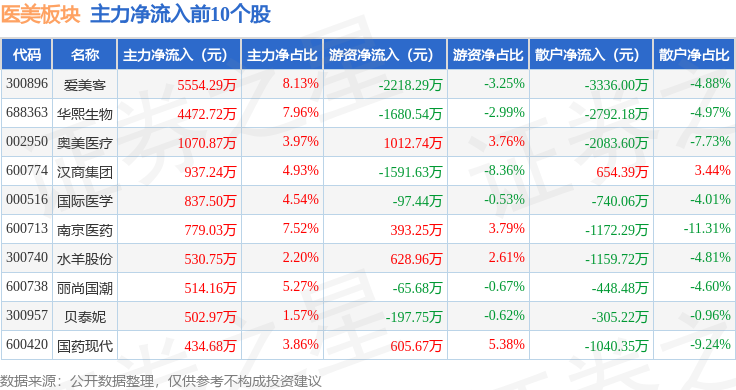 从资金流向上来看,当日医美板块主力资金净流出11.59亿元,游资资金净流入5.12亿元,散户资金净流入6.47亿元。医美板块个股资金流向见下表: