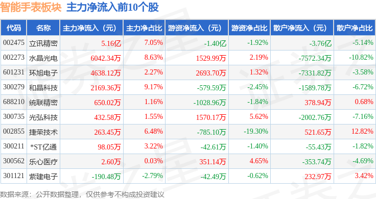 从资金流向上来看,当日智能手表板块主力资金净流出11.23亿元,游资资金净流入8.47亿元,散户资金净流入2.76亿元。智能手表板块个股资金流向见下表: