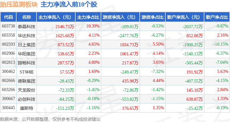 从资金流向上来看,当日胎压监测板块主力资金净流出3.62亿元,游资资金净流入5003.31万元,散户资金净流入3.12亿元。胎压监测板块个股资金流向见下表: